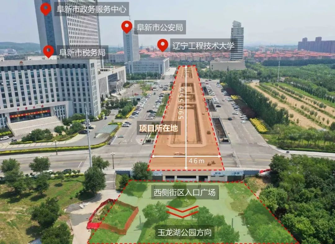 “湖滨广场”项目位于阜新市细河区,在主干道人民大街和湖滨路之间,距阜新高铁站仅1.2公里,东邻辽宁工程技术大学玉龙校区,北靠市民服务中心和市公安局,西接玉龙湖公园,在阜新城市发展主轴之上,坐落于城市双核心之一的玉龙新城中心。用地面积27910.53平方米,东西长596.55米,南北宽46米。在2008年玉龙新城整体规划中,“湖滨广场”项目作为行政办公区的景观、休息、交通枢纽和购物休闲商圈建设。