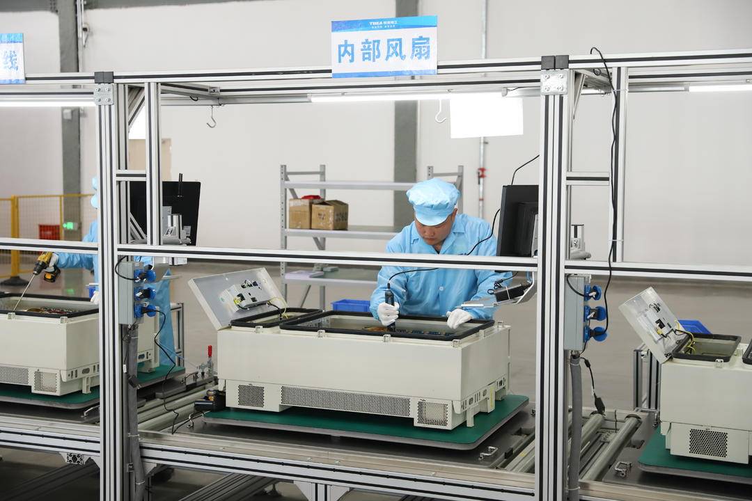 视线转向特变电工新能源阜新公司,崭新的生产车间里,首台SVG产品外形如同一个大型精密控制柜,内部密密麻麻排布着各类模块,科技感十足。