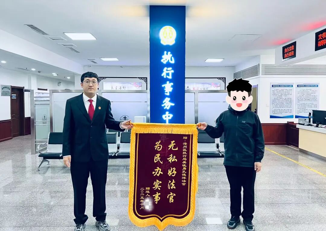 10月28日,阎某专程来到海州法院,将一面写有“无私好法官为民办实事”的锦旗送到两位执行员手中,对他们兢兢业业、不惧困难捍卫公平正义的工作作风表达由衷感谢。