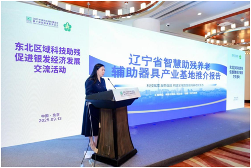 图为阜新市残联理事长霍红对辽宁省智慧助残养老辅助器具产业基地进行了专题推介